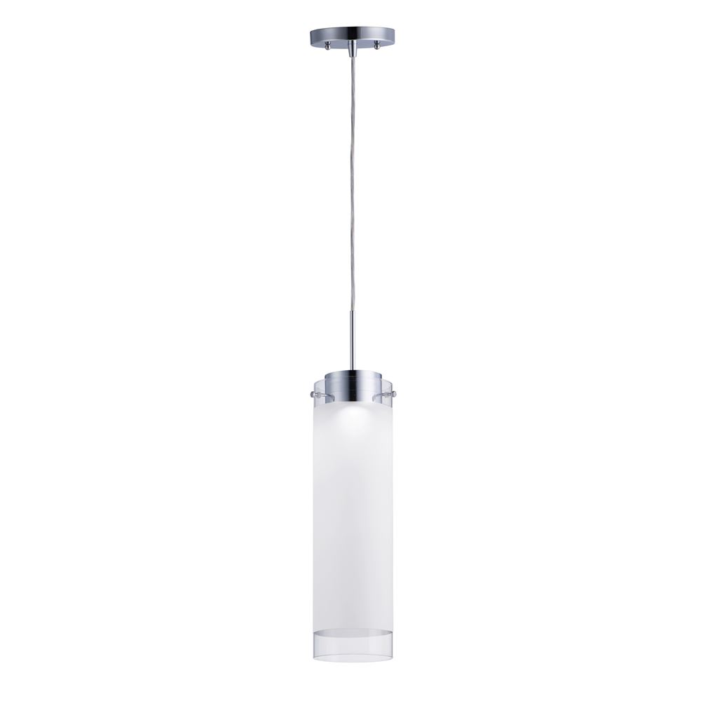 High tech LED modules are encased in die-cast housings finished in Polished Chrome. They support Frost glass cylinders with a Clear reveal on both ends. This classic design is a staple for contemporary pendants. Available in three sizes.