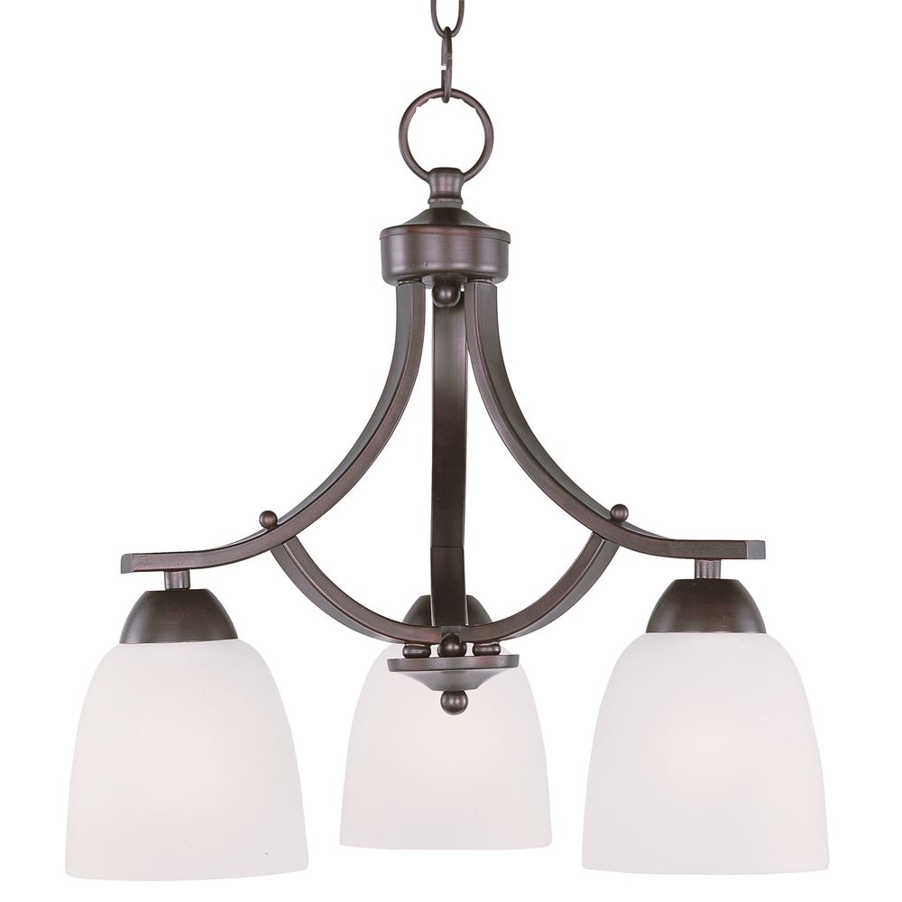 This transitional design works in any style home. Intersecting, rectangular tubing finished in your choice of Satin Nickel or Oil Rubbed Bronze gently curves to support simple line Frost glass shades.
