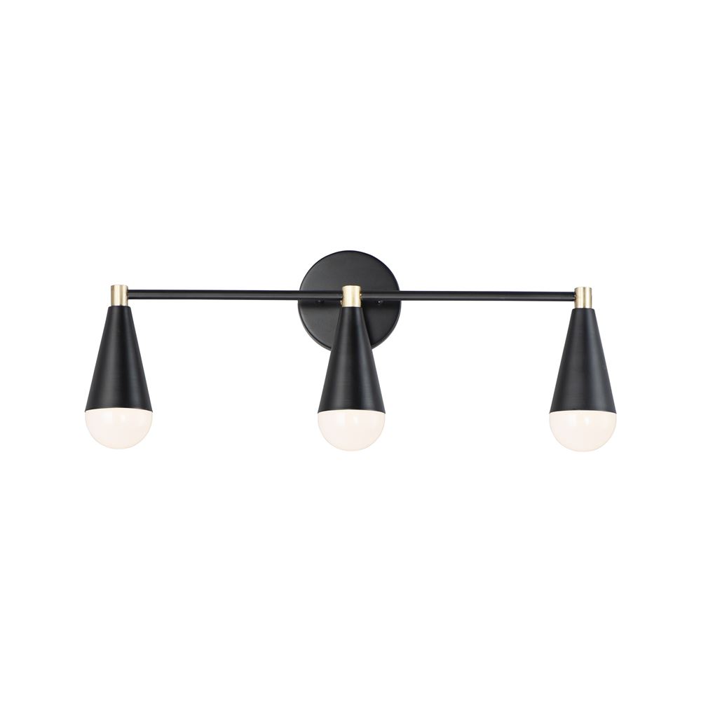 A classic mid-century look, the Lovell collection features two sizes of sputnik chandeliers and streamlined sconces perfect for bath vanity applications. Available in a Black/Satin Brass finish combination. Light bulbs nest inside the metal cones to become an element of the design.