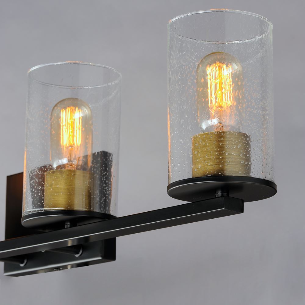 Cylinders in Clear Seedy glass on simple matte Black frames with Antique Brass socket covers. A clean and easily maintained fixture that easily coordinates with your stylish bathroom space.