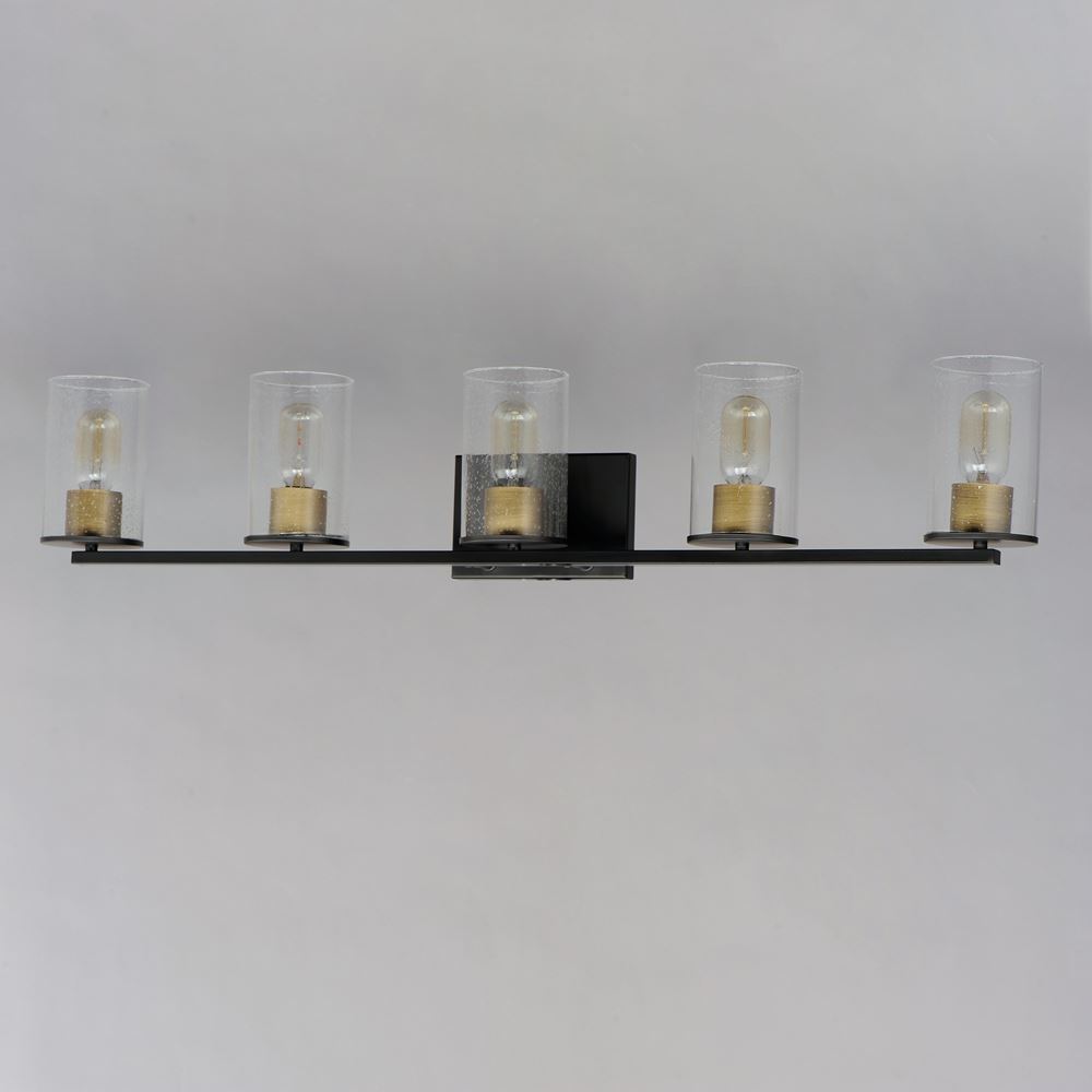 Cylinders in Clear Seedy glass on simple matte Black frames with Antique Brass socket covers. A clean and easily maintained fixture that easily coordinates with your stylish bathroom space.