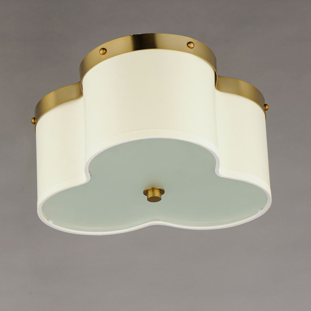 A classic scalloped fabric shade with decorative metal trim and rivets. Using an Off-White linen fabric shade, and accented with Aged Brass metalwork, this design is timeless and elegant.