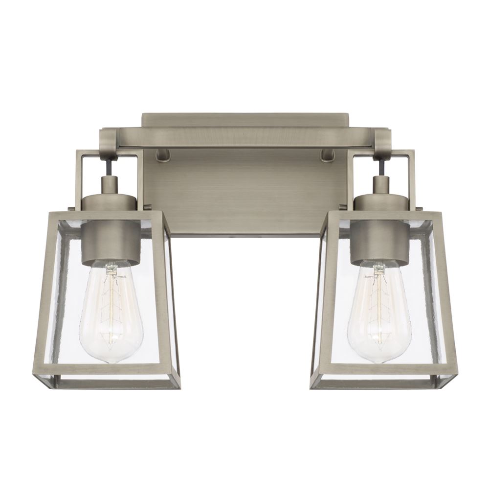 Accentuate urban industrial styling in the bath with the Kenner 2-light vanity fixture. Rain glass shades offer subtle optical texture while hinting at nautical flair. The Antique Nickel finish and distinctive detailing such as lantern-style hooks enrich the fixture's coastal side.