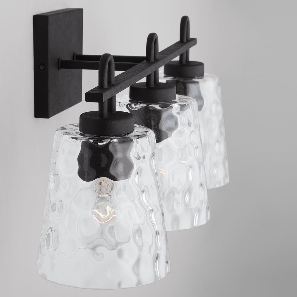 Textured black iron finish emphasize the loops on the metal frame, paired with dimples on the water glass of this 3-Light Vanity.