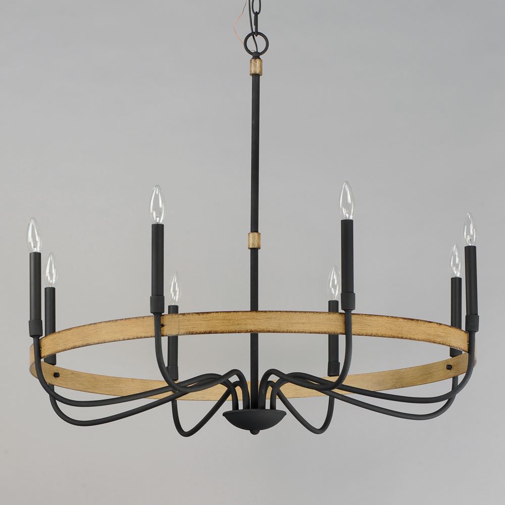 Rustic charm in an elegant, yet simple chandelier with warm distressed wood finishes and textured black metal arms. White candle covers evoke wax candles to complete the classic and transitional appeal of this series. The flush mount features a satin white diffuser to soften the lamps within.