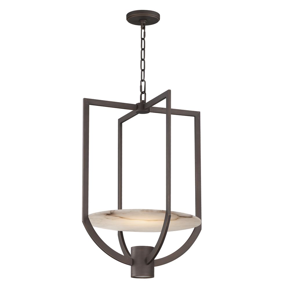 Modern, yet representative of the classic inverted bowl pendants, the Quarry collection features natural Spanish alabaster in an iron frame finished in Darkened Bronze. An inverted bowl form is created using the alabaster's straight line and the empty space below it. Slim housings of LED direct light both up at the alabaster to highlight the stone's character, while another direct light downward for functional use below.