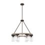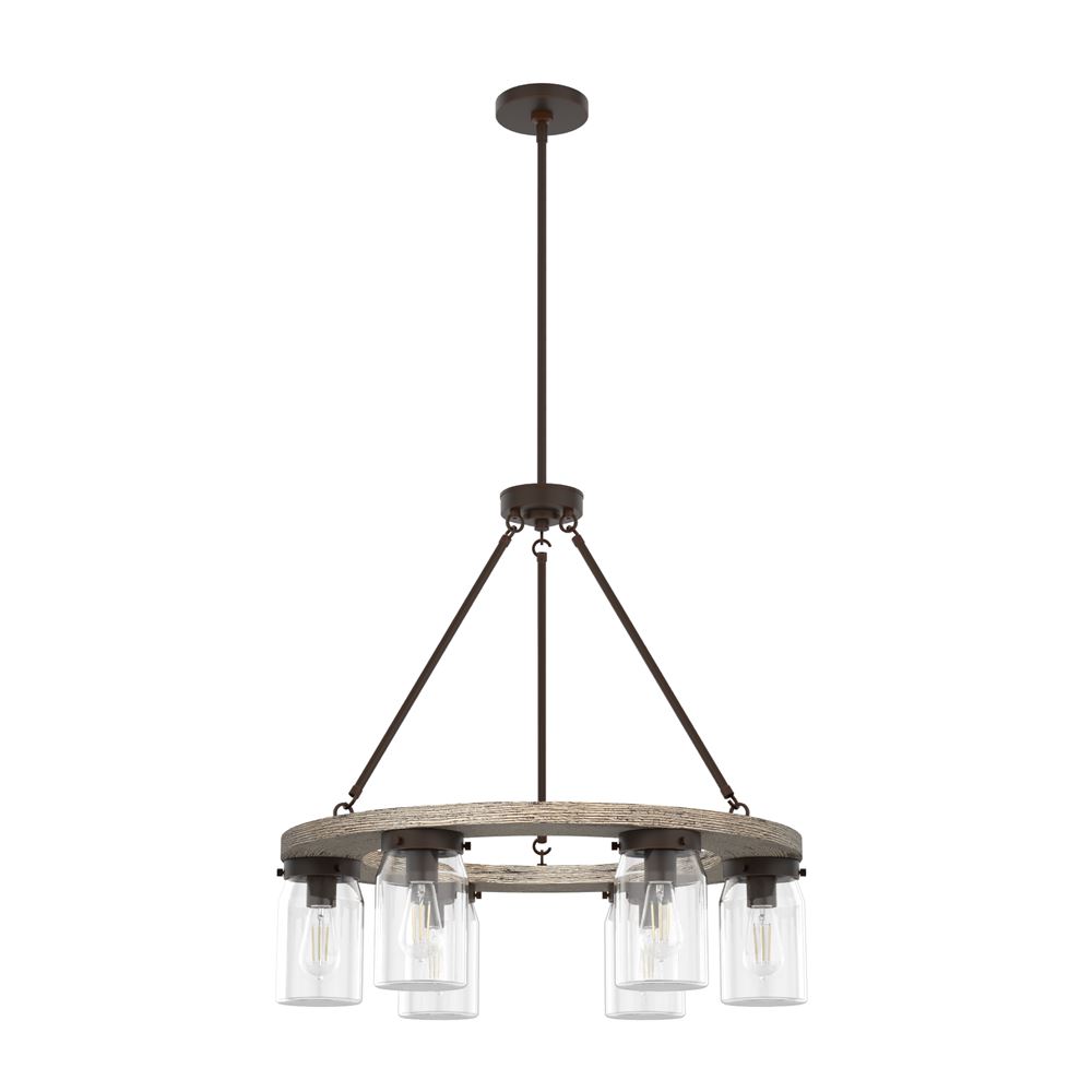Simply charming, the Devon Park round chandelier's rustic wood finishes and ball jar inspired glass shades create a look perfect for rustic and farmhouse style spaces. This 6-light chandelier provides opportunity for ample lighting. The warm glow from Edison LED bulbs creates a welcoming ambiance in your space.