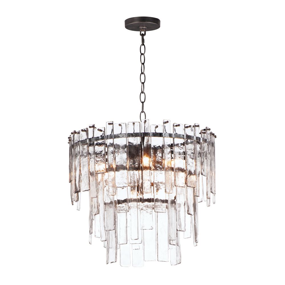 Sophisticated glass forms of uniquely organic character drapes rings of Darkened Bronze metal. The Warren series features handcrafted molten glass draped on rings in a darkened bronze finish. This handsome approach to tiered glasswork pendants delivers a warmer and moodier aesthetic and enhances a classic contemporary look.