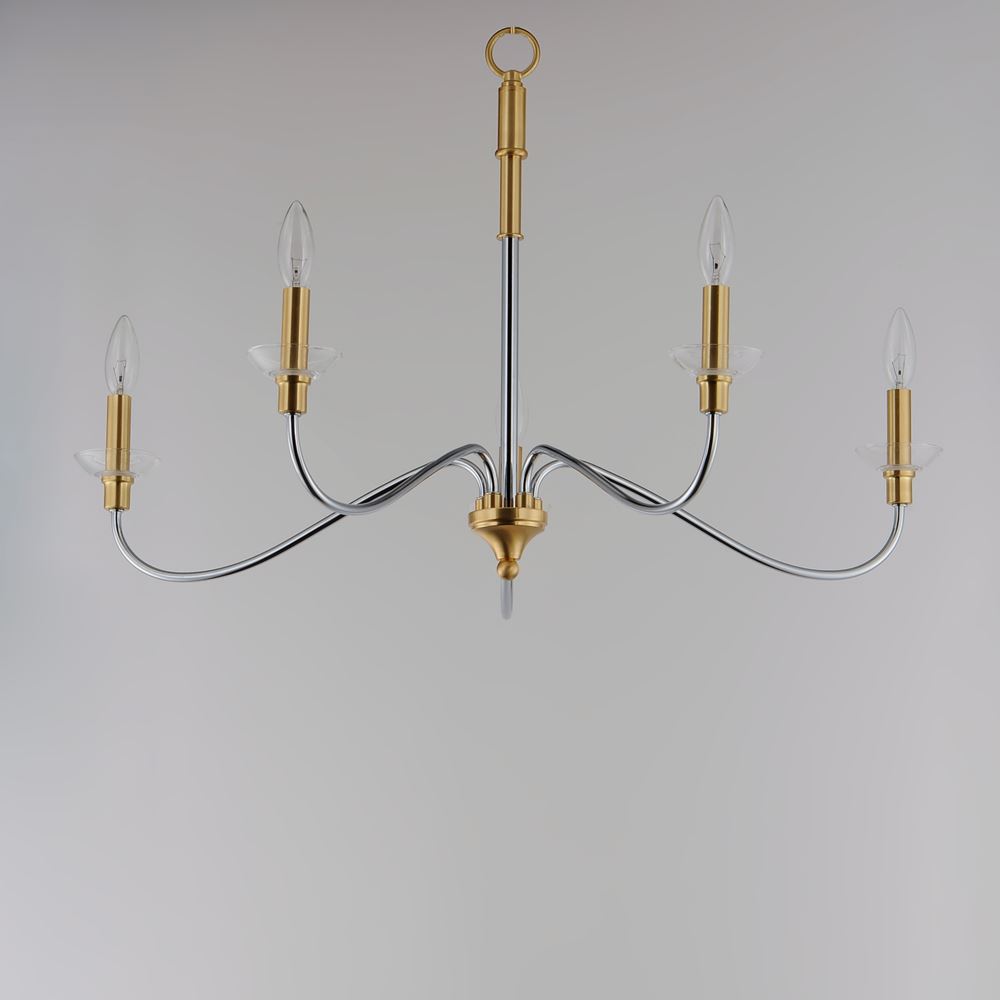Combination of contemporary Polished Chrome and a softer Satin Brass revitalizes a classic form. Glass bobeches complete the look creating an airy and simple chandelier group. Get that casual luxe look with minimalistic, transitional forms.