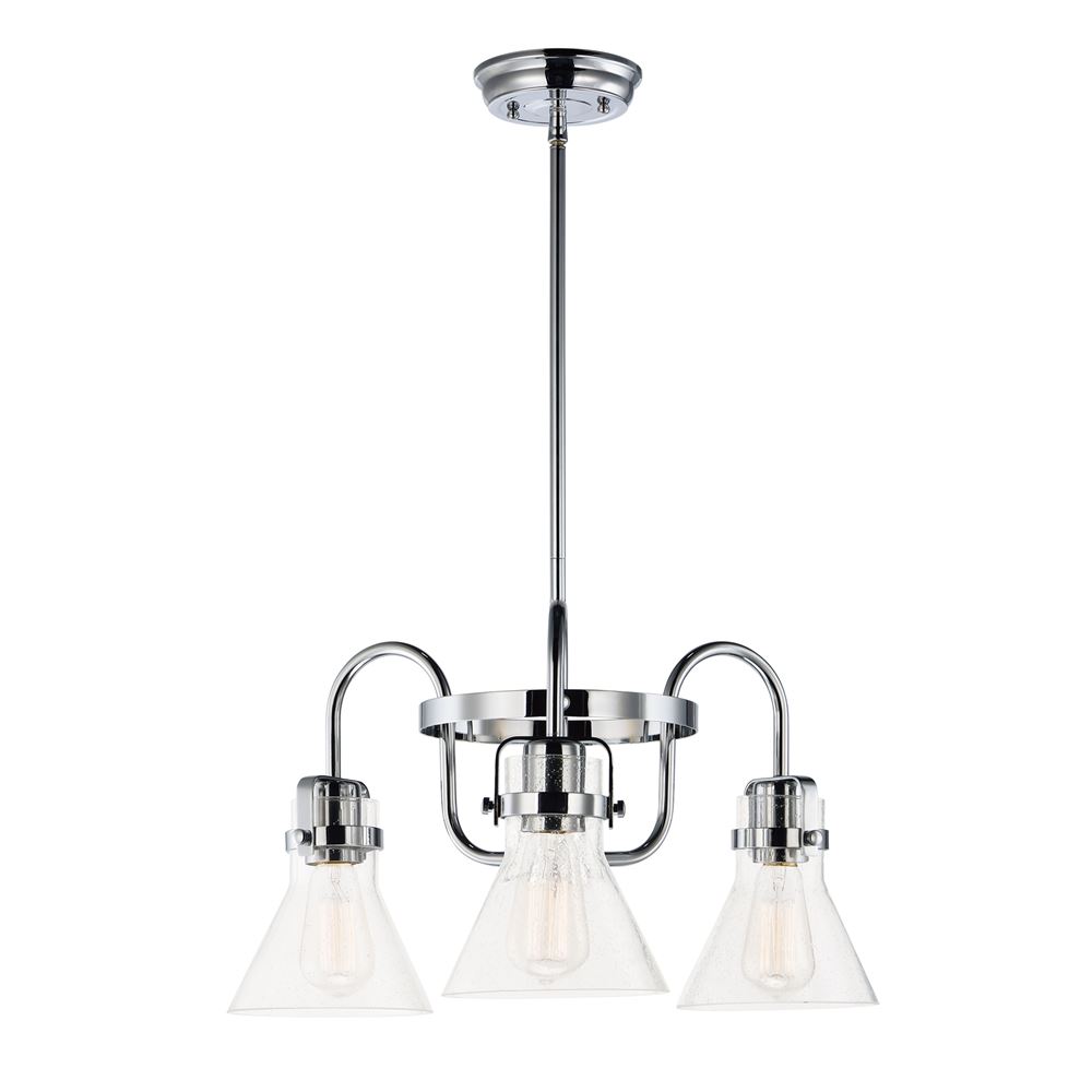 This nautical-inspired bath vanity features Clear Seedy glass cones suspended by a yoke frame finished in Polished Chrome. The clear glass offers abundant lighting and compliments the styling of the fixture. Make it a more industrial look by adding filament E26 light bulbs.