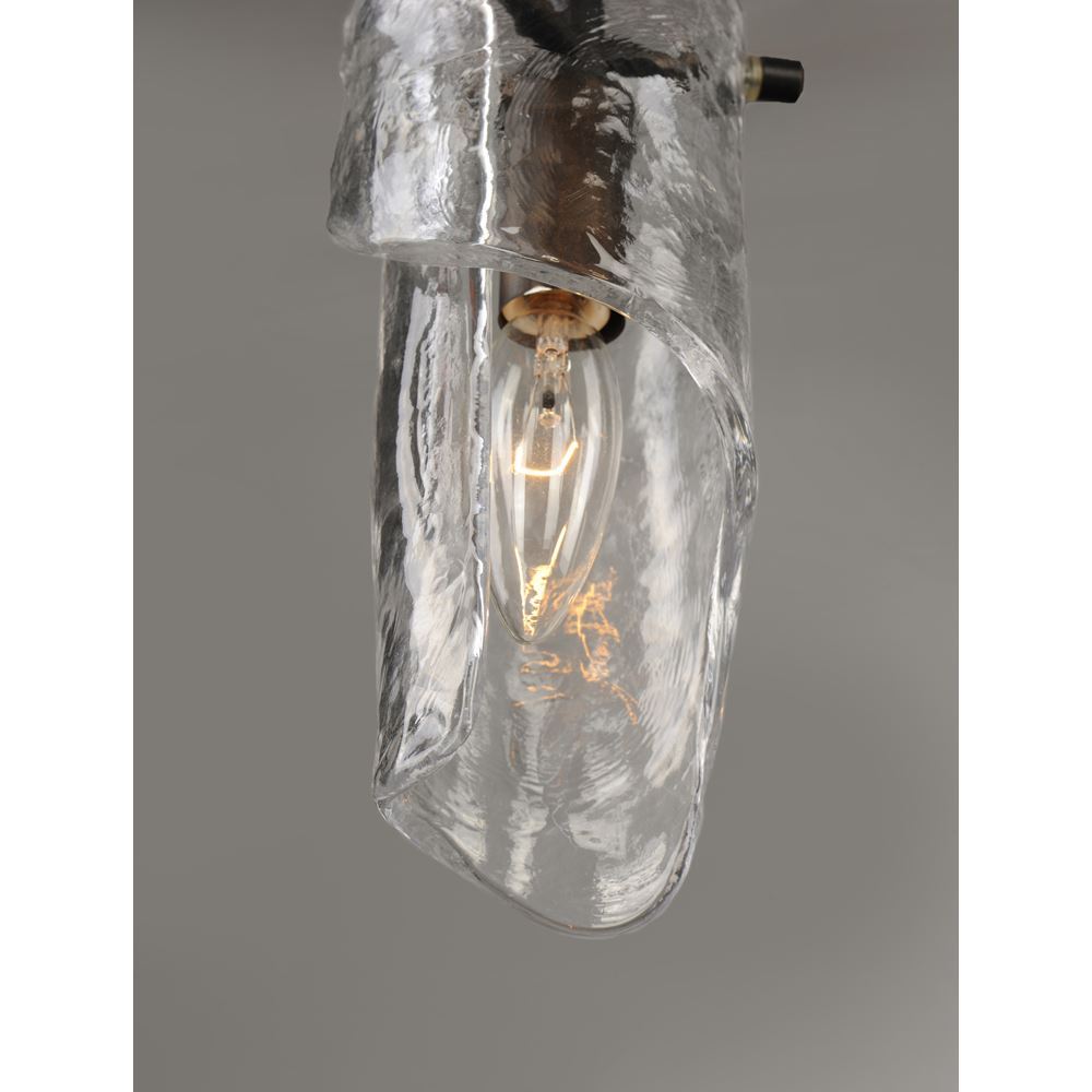 Forged arms finished in Chestnut Bronze are suspended in a mobile-like fashion to create an interesting work of art. Suspended from the hook at each end are beautiful hand formed Clear piastra-styled glass which adds elegance to this bold design.