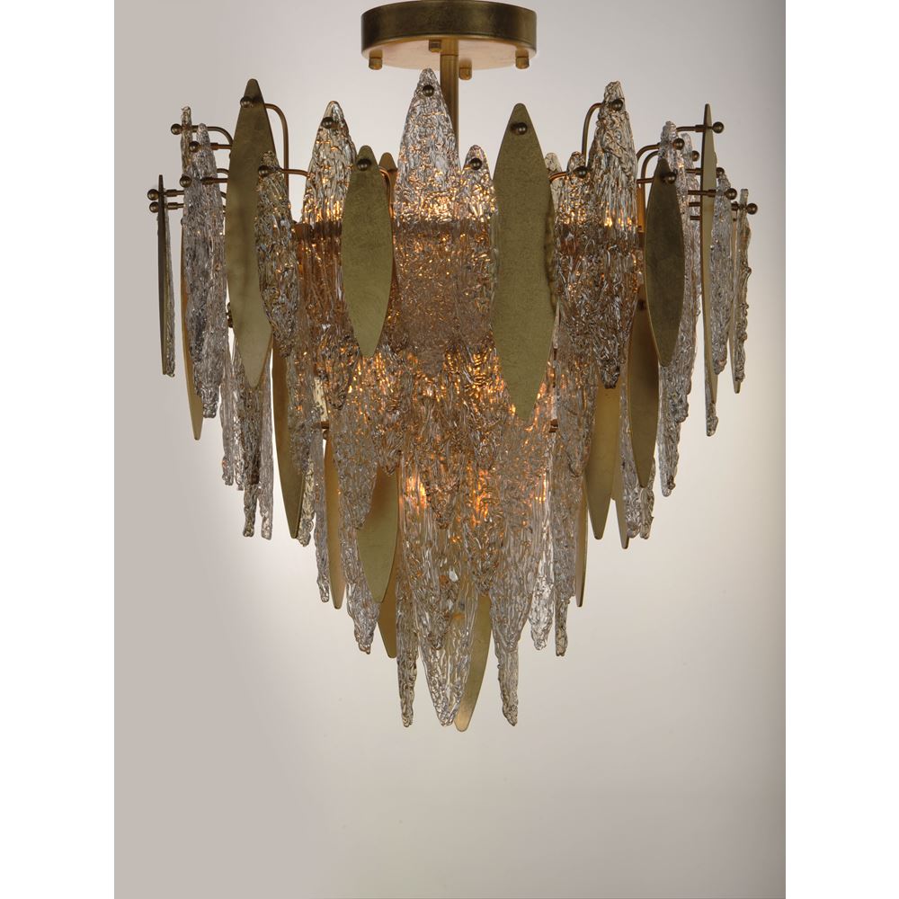 Hand-formed glass petals of Clear and Champagne-tint suspend from a tiered frame of gold and accented with petals of solid metal finished in Gold Leaf. Numerous candelabra sockets are strategically placed within the fixture to create glimmer and elegance to this majestic collection.