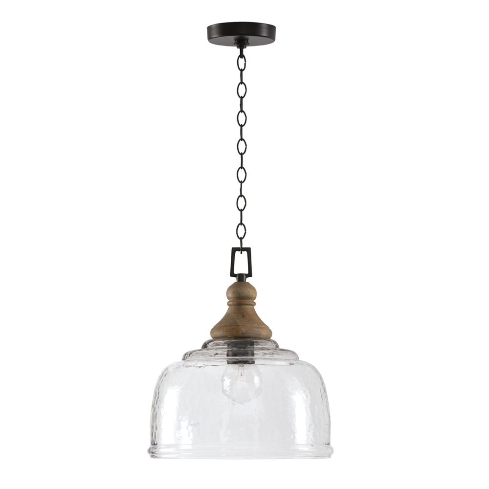 Create a space awash in sunny, coastal style with this dome glass pendant. A finial sculpted of mango wood is hand finished in Grey Wash. The lamp is housed in a gorgeous, thick-rimmed Rippled Glass shade. Brimming with seaside vibes and rustic charm, this fixture is perfect as a dining room pendant, or to illuminate the kitchen island.