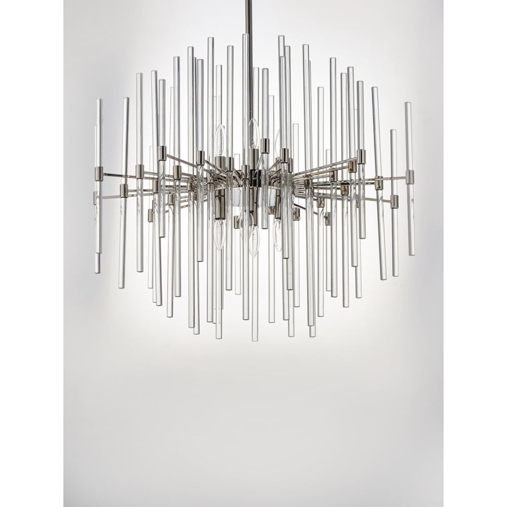The composition of Clear glass rods are elegantly supported by thin radial arms of different length in a collection that is truly Divine. Finished in Polished Nickel, the simplicity of this design delivers a crisp lighting fixture that works in a multitude of interior genres from contemporary to traditional.