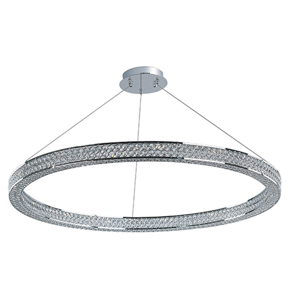 Frames of metal rings encased with Beveled Crystal Jewels, are finished in Polished Chrome. Suspended by cables as if floating In air, these rings cast rainbows of light when illuminated by the Integrated LED.