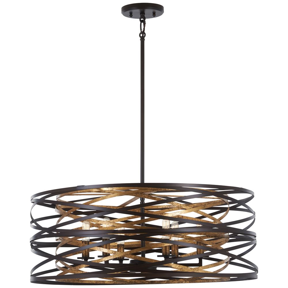 This 6-LT Pendant from Minka Lavery has a finish of Dark Bronze W/Mosaic Gold Inte and fits in well with any Contemporary style decor.