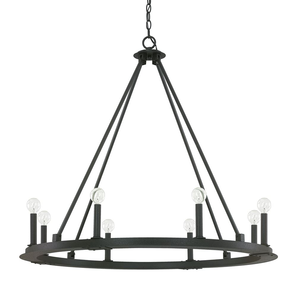 Clean lines and simple styling give our Pearson 8-light chandelier maximum versatility, along with its rustic Black Iron finish. Choose bulbs to complement your personal style: round G16 bulbs for modern, classic chandelier bulbs for classic or vintage-style bulbs for an industrial look.