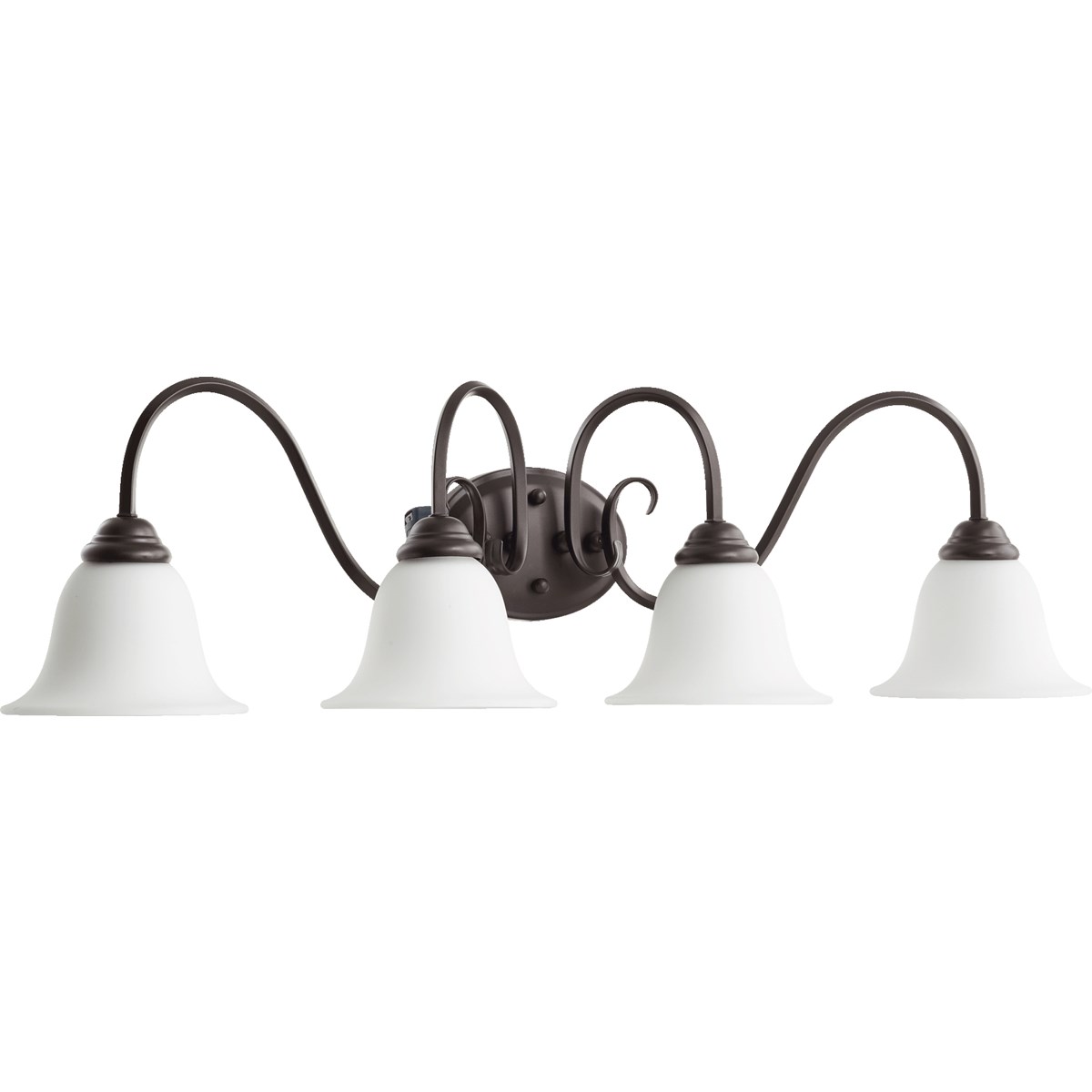 This Spencer 4-LT Vanity from Quorum has a finish of Oiled Bronze W/ Satin Opal and fits in well with any Quorum Home Collection style decor.