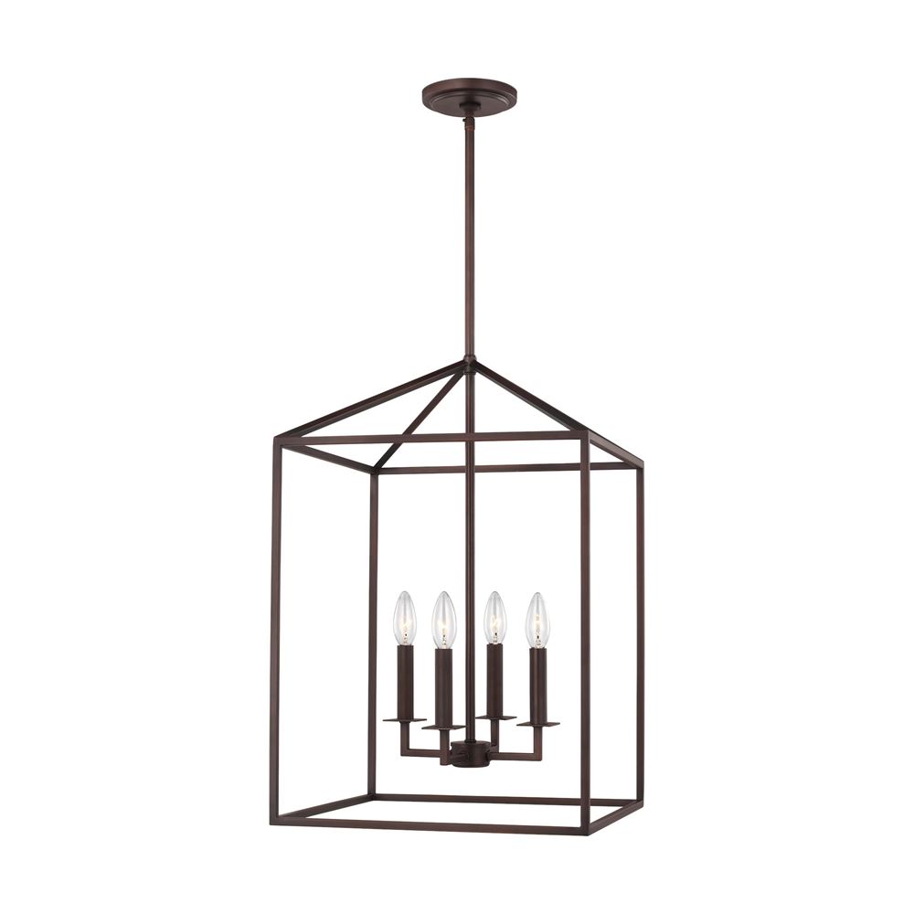 The transitional Perryton pendant light collection by Sea Gull Lighting is inspired by stately, carriage lanterns. The updated open frame is formed with sleek square steel tubing, and each pendant is a generously proportioned, minimalist silhouette completed in either textured Blacksmith or Heirloom Bronze finishes. Offered are small and large four-light hall/foyer pendants, an eight-light hall/foyer pendant and an eight-light island pendant. Incandescent candelabra base lamping.