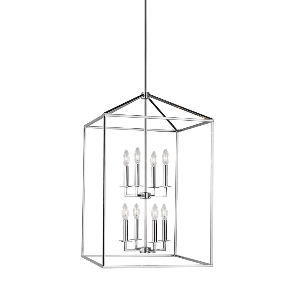 The transitional Perryton pendant light collection by Sea Gull Lighting is inspired by stately, carriage lanterns. The updated open frame is formed with sleek square steel tubing, and each pendant is a generously proportioned, minimalist silhouette completed in either textured Blacksmith or Heirloom Bronze finishes. Offered are small and large four-light hall/foyer pendants, an eight-light hall/foyer pendant and an eight-light island pendant. Incandescent candelabra base lamping.