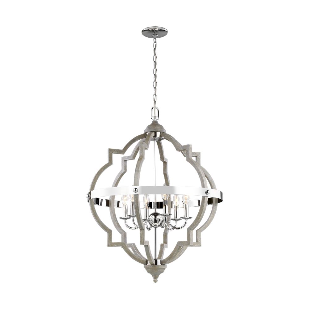 The transitional Socorro lighting collection by Sea Gull Lighting features a classic, barbed Quatrefoil profile - wholly updated by combining a distressed Cerused Oak finish on the decorative silhouette with the rich Stardust finish on the metal bobeches and decorative strapping to create undeniable rustic charm.