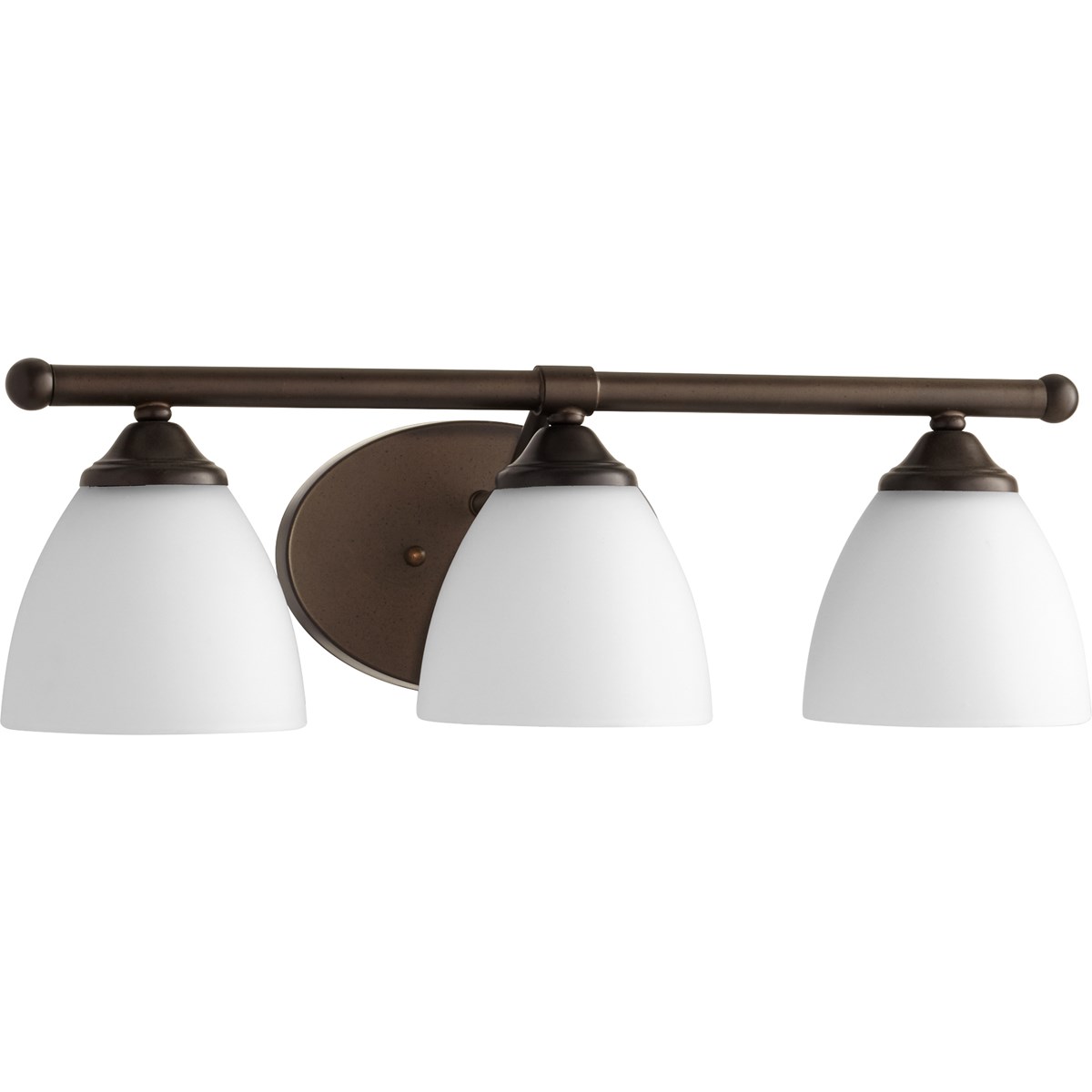 This Brooks 3-LT Vanity from Quorum has a finish of Oiled Bronze W/ Satin Opal and fits in well with any Quorum Home Collection style decor.