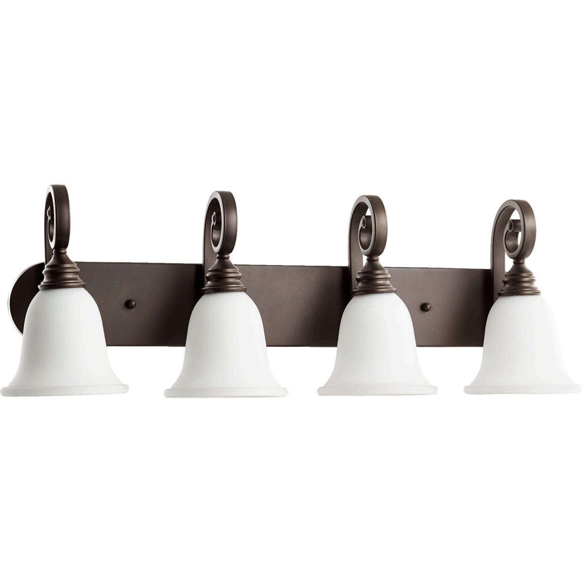 This Bryant 4-LT Vanity from Quorum has a finish of Oiled Bronze W/ Satin Opal and fits in well with any Quorum Home Collection style decor.