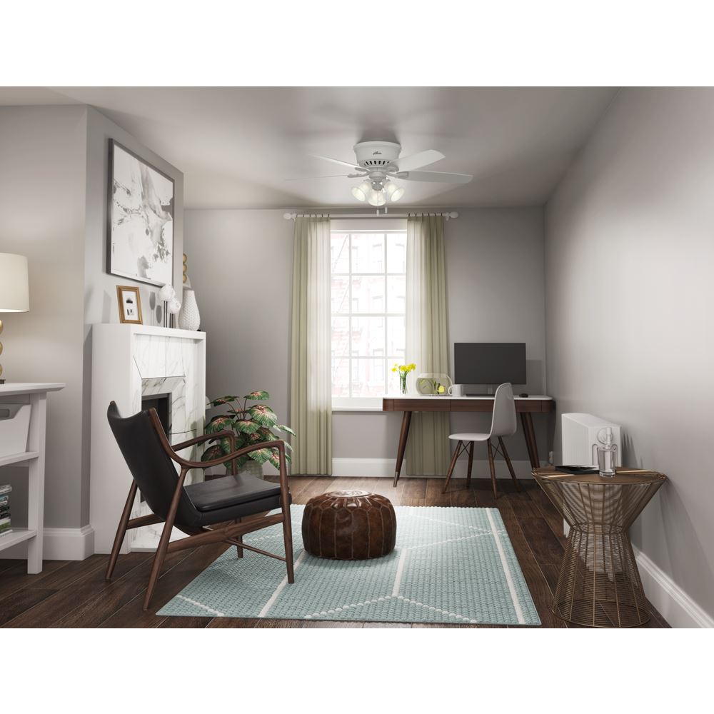 With a 52-inch blade span and low-profile design, the casual, traditional style of the Builder Low Profile will complement large rooms in your home without overpowering them. A mainstay in the Hunter product line, this low-profile ceiling fan with lights features three-speed WhisperWind motor technology to deliver quiet and ultra-powerful performance.