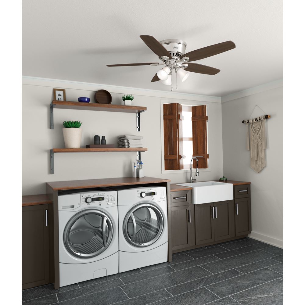 With a 52-inch blade span and low-profile design, the casual, traditional style of the Builder Low Profile will complement large rooms in your home without overpowering them. A mainstay in the Hunter product line, this low-profile ceiling fan with lights features three-speed WhisperWind motor technology to deliver quiet and ultra-powerful performance.