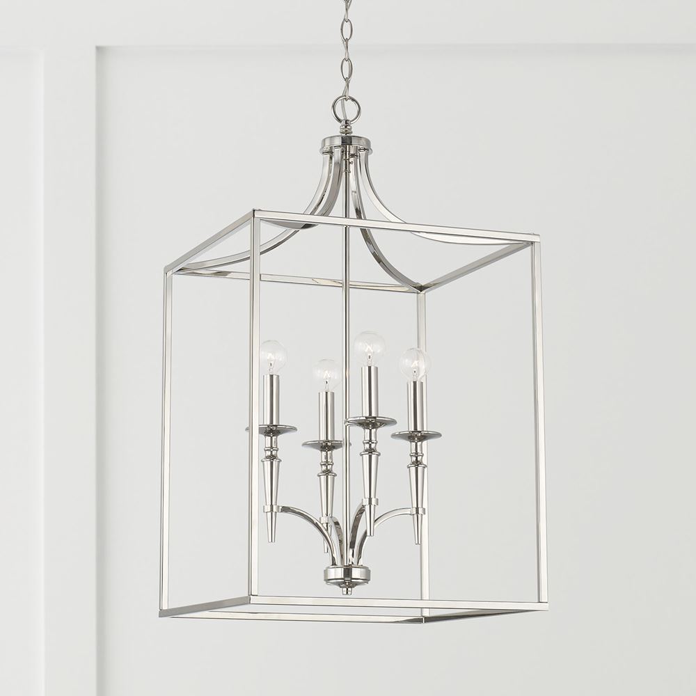 Straight edges and striking curves intersect in the Abbie 4-Light Foyer. The dramatic candlestick detailing in Polished Nickel brings a contemporary nod to the lantern design.