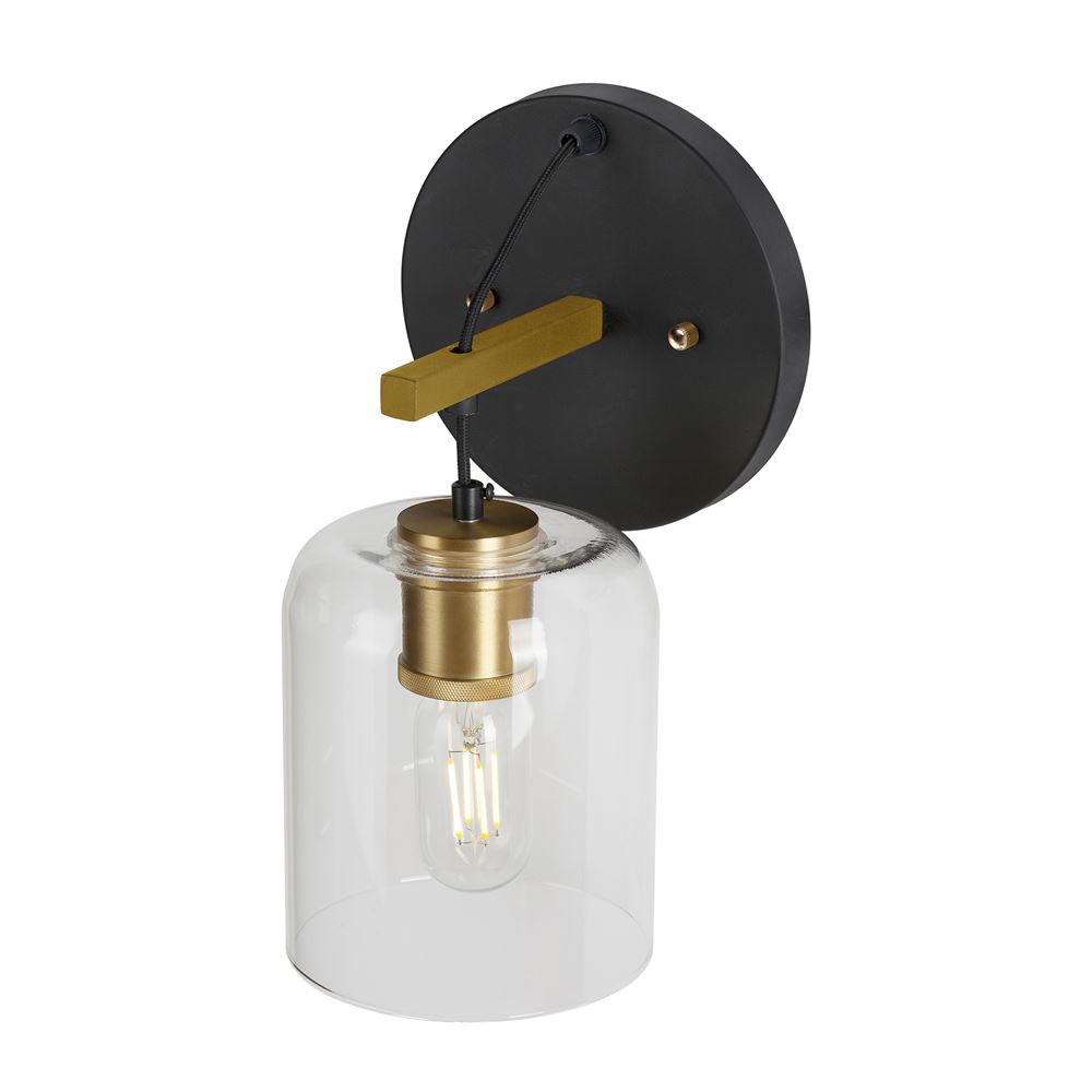 The Tyrone transitional sconce comes in black finish steel with soft gold finish steel accents. This fixture is sophisticated yet simple and comes with a clear glass bell shaped shade and square tubing. This sconce is suitable for hallways and bedrooms. Add an Edison style bulb for a more a more transitional look or an 'A' type LED for a more contemporary feel. This 1-light sconce measures 6.75 in. L x 6.75 in. W x 12.50 in.