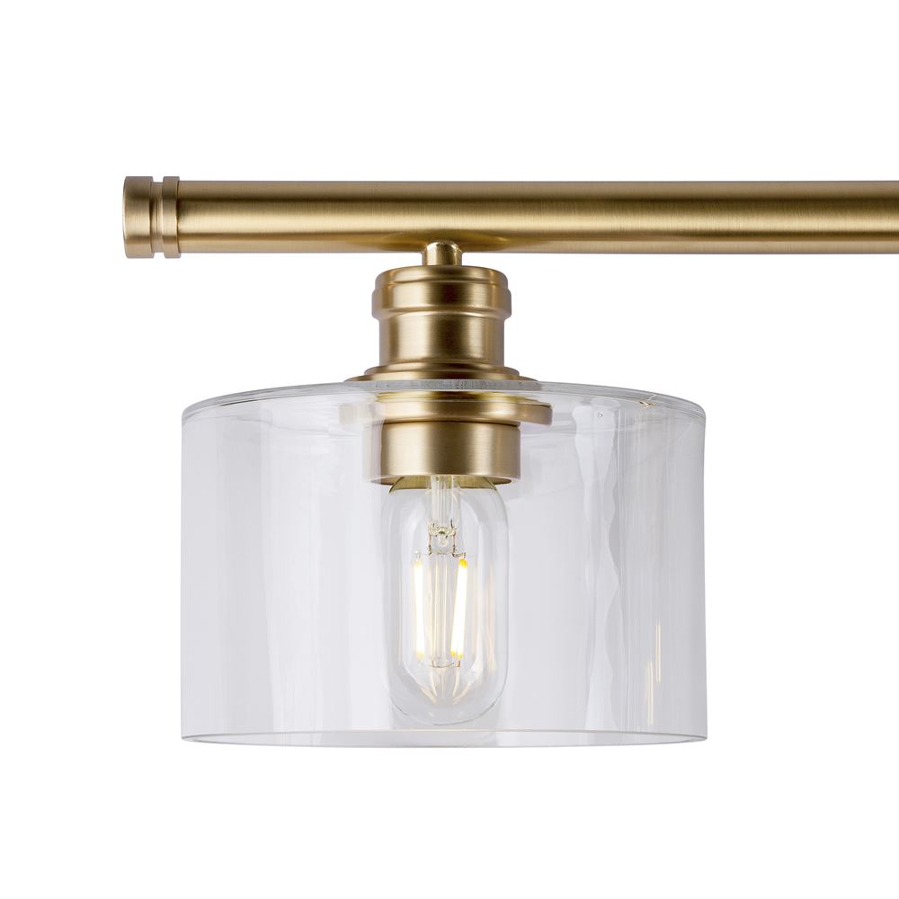The Zane gold finish steel vanity fixture with oversized clear glass shades features simple clean lines for the bath. This family comes in either black or gold finish. Add an Edison style bulb for a more transitional look or an 'A' type LED for a more contemporary feel. This 4-light vanity measures 44.75 in. L x 8.25 in. D x 9.25 in. H.