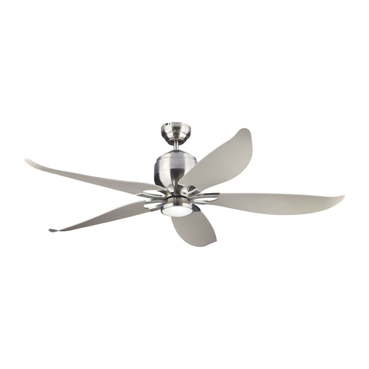 A floral inspiration takes the sleek, modern aesthetic of the Lily ceiling fan by Monte Carlo to a bright and whimsical level. The upward curve of the blade tips and the u-shaped blade irons combine to cleverly use negative space to create a light, airy, organic silhouette. There is a 15W integrated LED downlight encased in Clear Frosted glass, with 715 net lumens of output, 2700K CCT and a CRI of 80+. A hand-held remote with six speeds, reverse and LED light dimmer is included. Damp-rated.