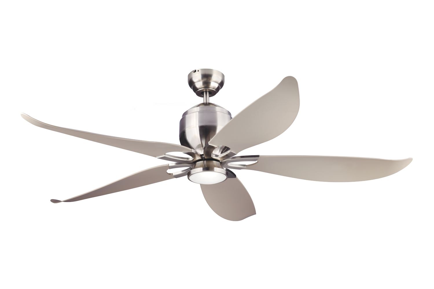 The Monte Carlo 56" Lily -Brushed Steel in brushed steel features a 120.0 X 25.0 6 speed motor with a Fourteen degree blade pitch. A floral inspiration takes the sleek, modern aesthetic of the Lily ceiling fan by Monte Carlo to a bright and whimsical level. The upward curve of the blade tips and the u-shaped blade irons combine to cleverly use negative space to create a light, airy, organic silhouette. There is a 12W integrated LED downlight encased in Clear Frosted glass, with 740 net lumens of output, 2700° CCT and a CRI of 80+. A hand-held remote with six speeds, reverse and LED light dimmer is included.