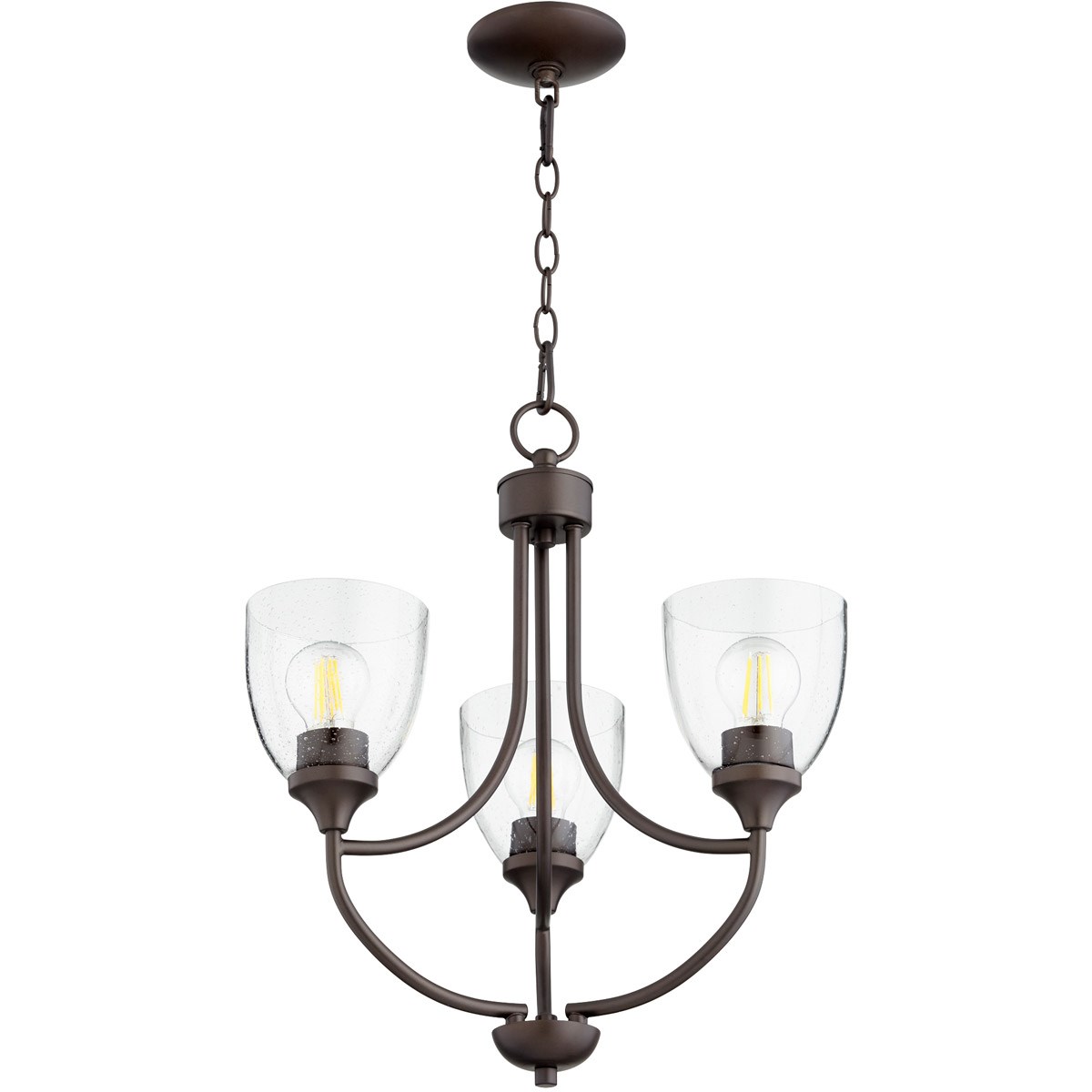 This Enclave Chandelier from Quorum has a finish of Oiled Bronze W/ Clear/Seeded and fits in well with any Quorum Home Collection style decor.