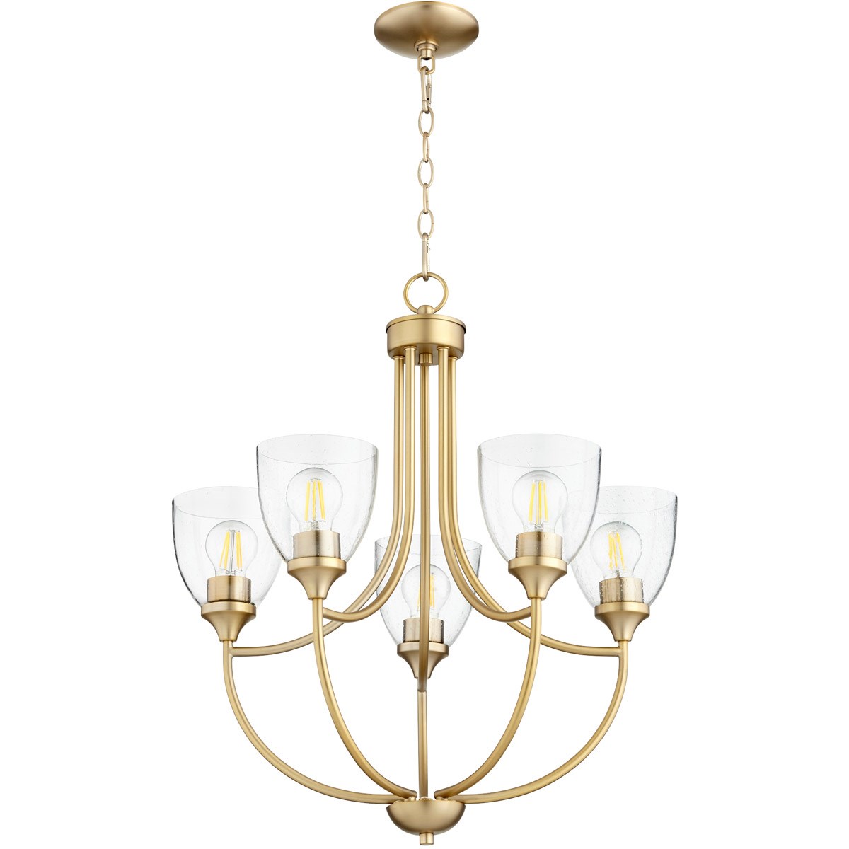 This Enclave Chandelier from Quorum has a finish of Aged Brass W/ Clear/Seeded and fits in well with any Quorum Home Collection style decor.