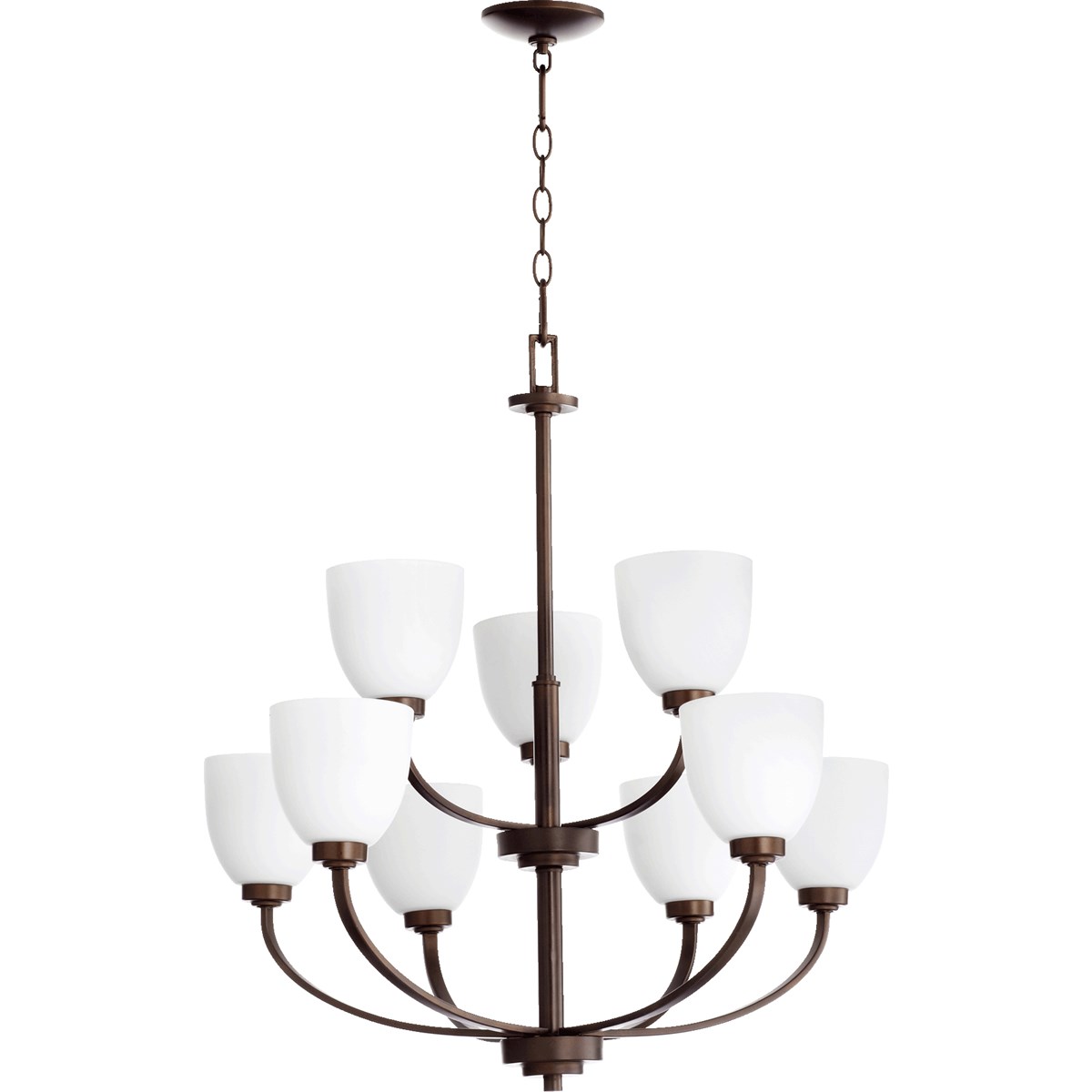 This Reyes 9-LT Chandelier from Quorum has a finish of Oiled Bronze and fits in well with any Quorum Home Collection style decor.