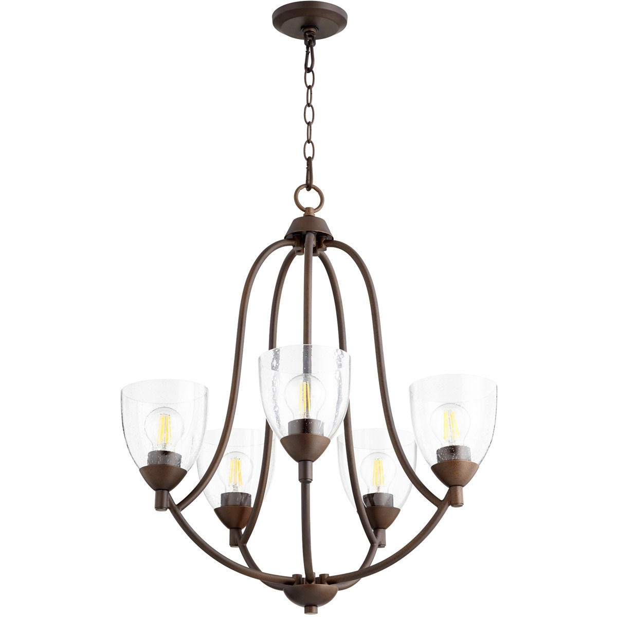 This Barkley Chandelier from Quorum has a finish of Oiled Bronze W/ Clear/Seeded and fits in well with any Quorum Home Collection style decor.