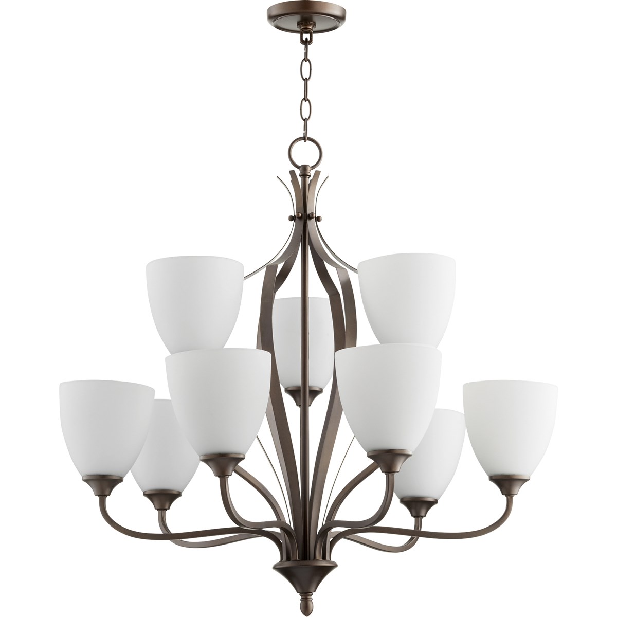 This Jardin 9-LT Chandelier from Quorum has a finish of Oiled Bronze and fits in well with any Quorum Home Collection style decor.