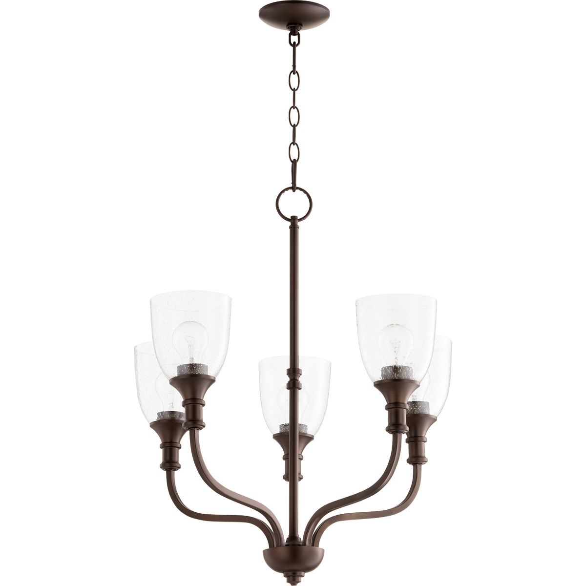 This Richmond Chandelier from Quorum has a finish of Oiled Bronze W/ Clear/Seeded and fits in well with any Quorum Home Collection style decor.
