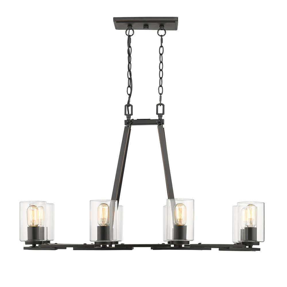 Overlapping arcs come together to form contemporary rings, supporting cylindrical clear glass shades in this clean and modern design. The matte black finish with gold highlights blends easily with many decors. Matching black socket covers are visible through the clear glass. The collection uses medium base bulbs. This 8-light linear pendant perfectly illuminates an elongated bar, dining table, or kitchen island.