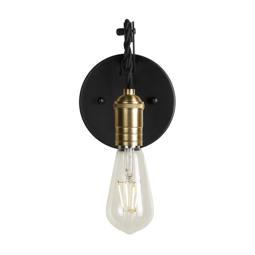 The nostalgic Essy wall fixture in black finish steel with gold colored steel socket comes with red braided cloth covered wire to complete the look. This fixture can be used as a sconce or as a vanity. Add an Edison style light bulb for maximum effect. This 1-light wall fixture measures 5 in. L x 4 in. D x 6.75 in. H.