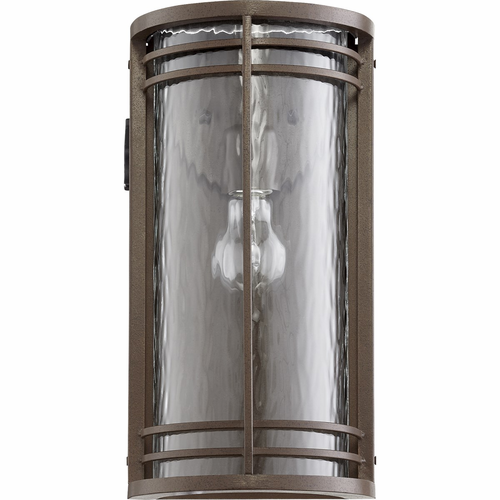 This Larson 7" Clear Outdoor Sconce from Quorum has a finish of Oiled Bronze W/ Clear Hammered Glass and fits in well with any Transitional style decor.