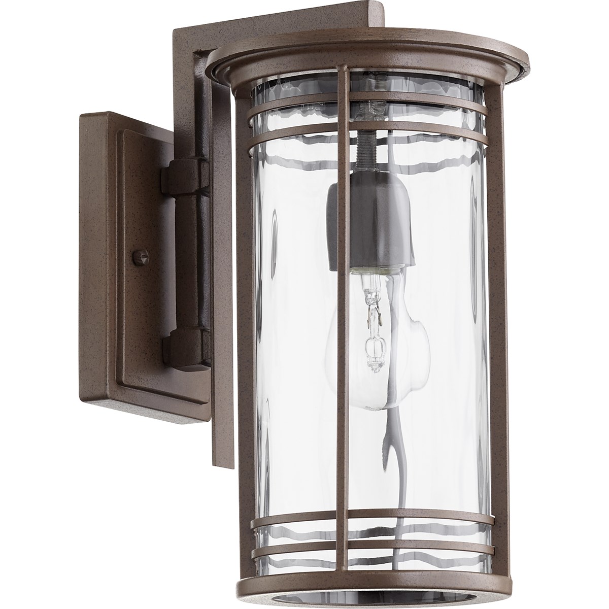This Larson 7" Clear Outdoor Lantern from Quorum has a finish of Oiled Bronze W/ Clear Hammered Glass and fits in well with any Transitional style decor.