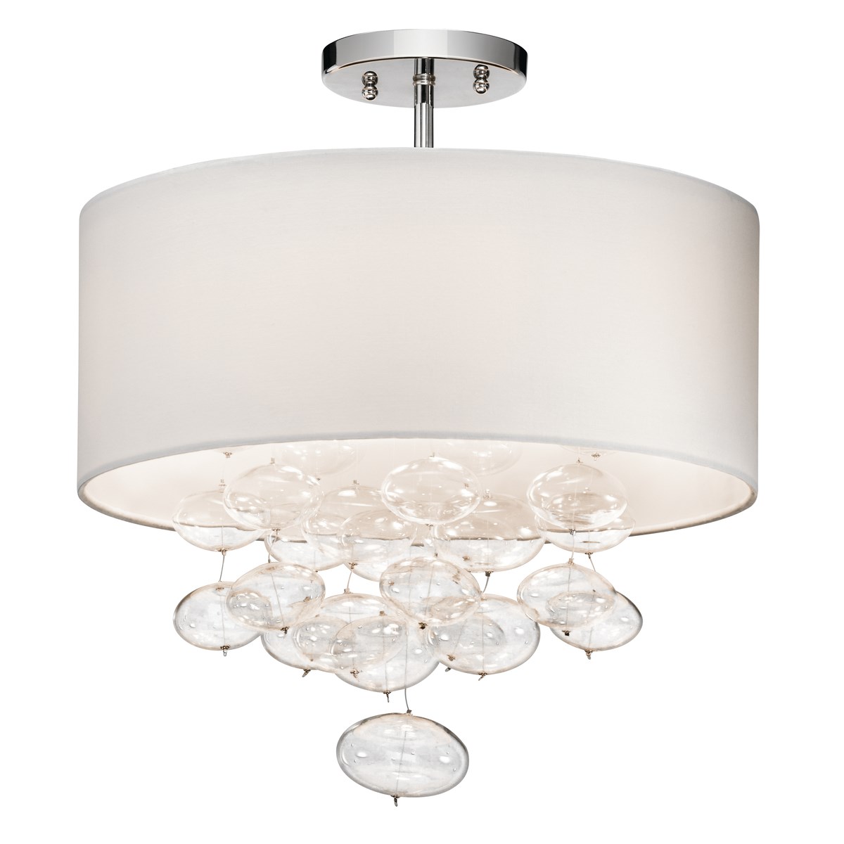 Piatt is a statement of delicate sophistication. Each blown glass bubble is subtly elongated to create an oval shape. These clusters are then suspended against a white hardback shade for a modern, clean-lined look.