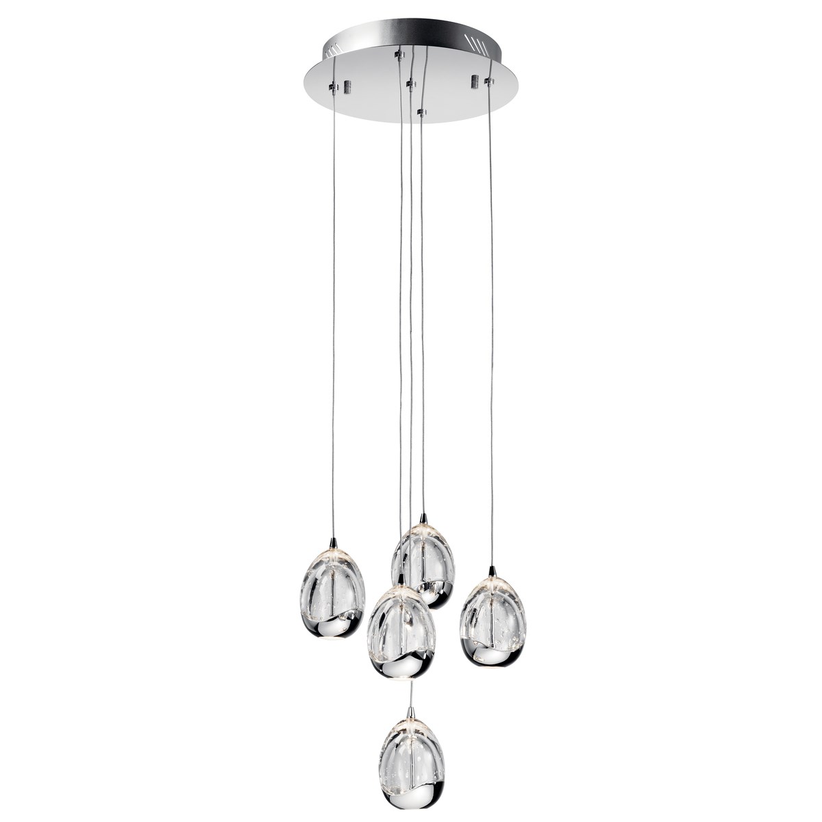 Glowing orbs of Bubble Crystal and Etched Acrylic lenses hang delicately, accented by Chrome Finish touches and canopy.