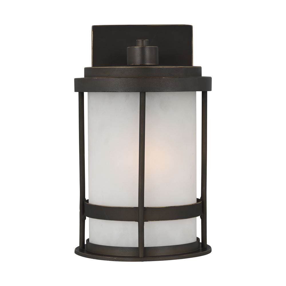 This Small 1-LT Outdoor Wall Lantern from Sea Gull has a finish of Antique Bronze and fits in well with any Transitional style decor.