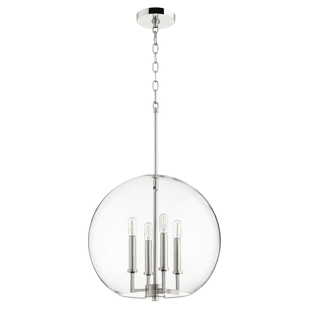 This 4-LT Globe Pendant from Quorum has a finish of Polished Nickel and fits in well with any Contemporary style decor.