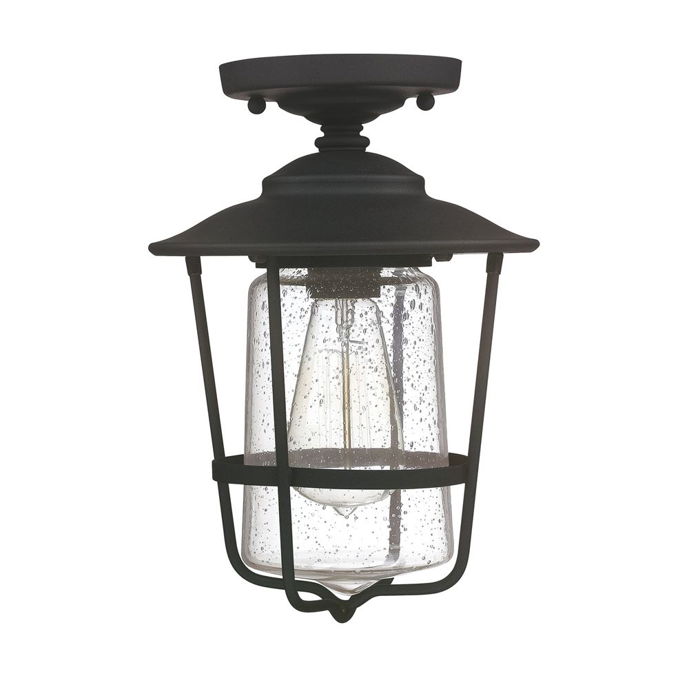 Inspired by Colonial architecture, the Creekside outdoor ceiling light in Black exudes nostalgic charm. A round canopy with miniature ball accents gives way to a stepped lid and an open cage that envelops its seeded glass. Boasting a harmonious aesthetic, this ceiling light brings illumination and interest to your covered porch or deck.