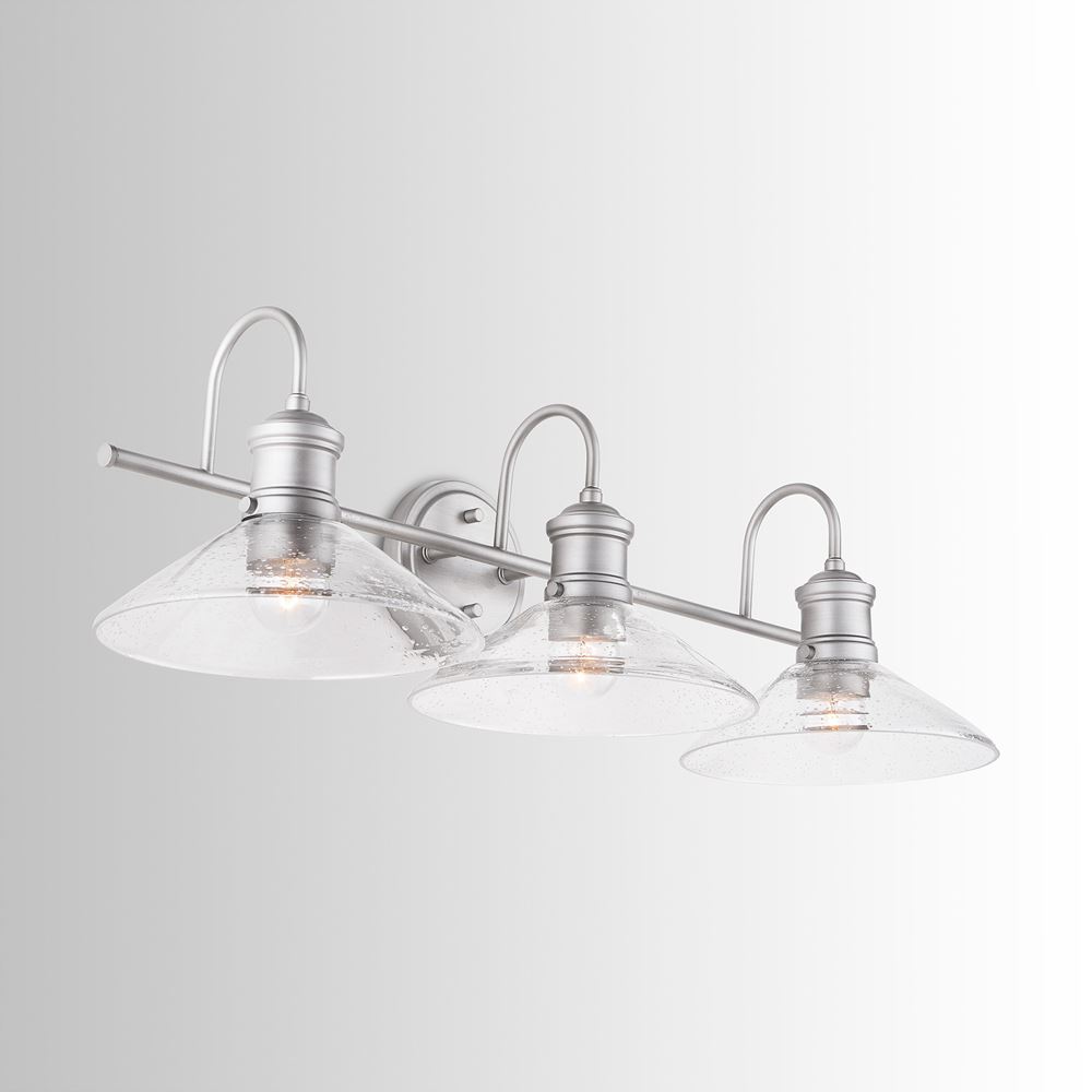 Seeded glass shades provide a modern flair to the simple charm of this Farmhouse style bathroom vanity. Curved arms support wide conical glass that offers warm ambient illumination with a touch of elegance. Choose Antique bulbs (not included) for an additional rustic touch.